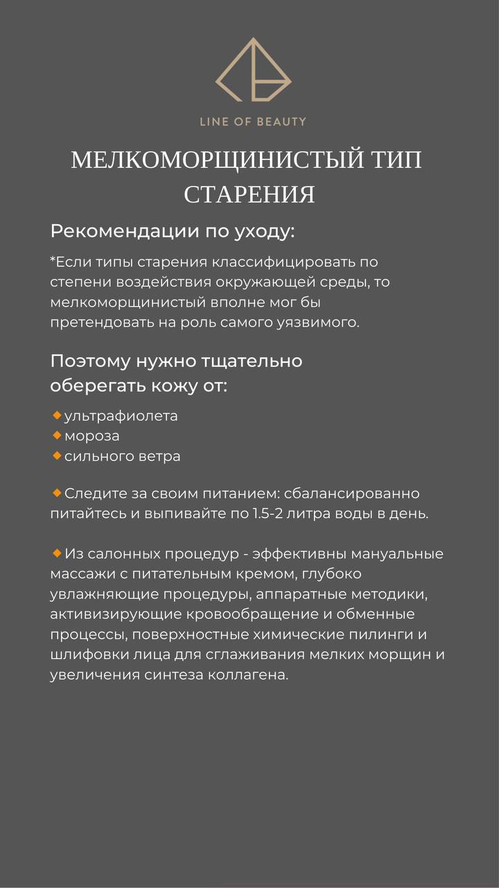 Этот тип характеризуется сухостью кожи, снижением её плотности и множеством мелких морщин — особенно вокруг глаз, губ и на щеках. Чаще встречается у женщин с сухой кожей и при недостаточной защите от солнца, но обусловлен генетически, как и остальные типы возрастных изменений.