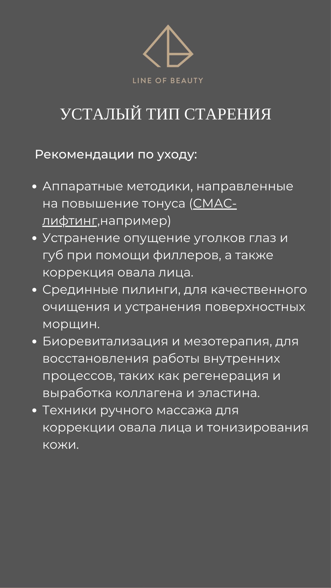 Усталый тип старения — хорошо поддается коррекции. Главное — не ждать, пока изменения станут слишком выраженными.